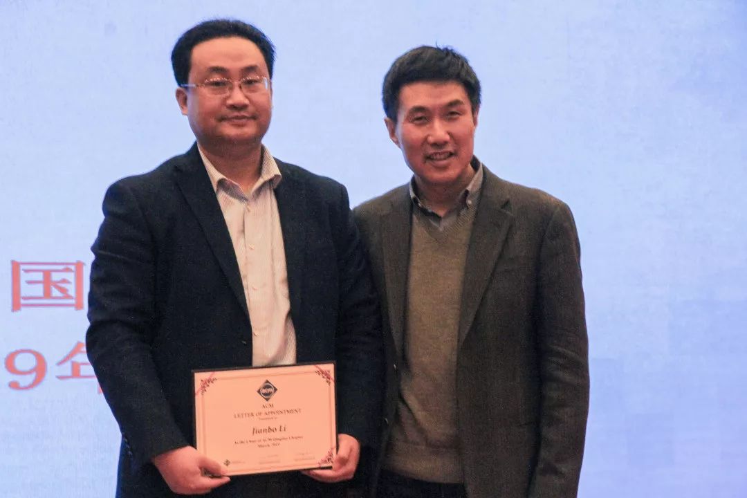 李向阳主席宣读了青岛分会组织架构名单,并与陈文光主席为青岛分会成员颁发聘书。中国海洋大学信息科学与工程学院副院长董军宇教授、我校玩球直播 院长李建波教授当选为ACM青岛分会共同主席。