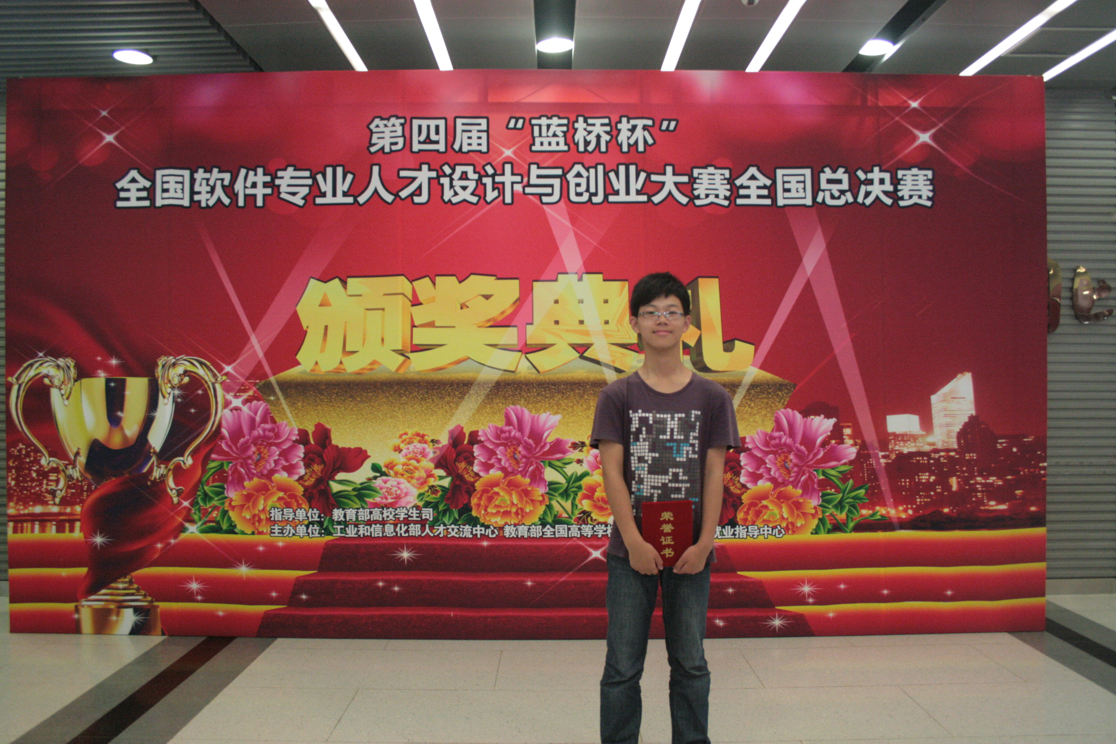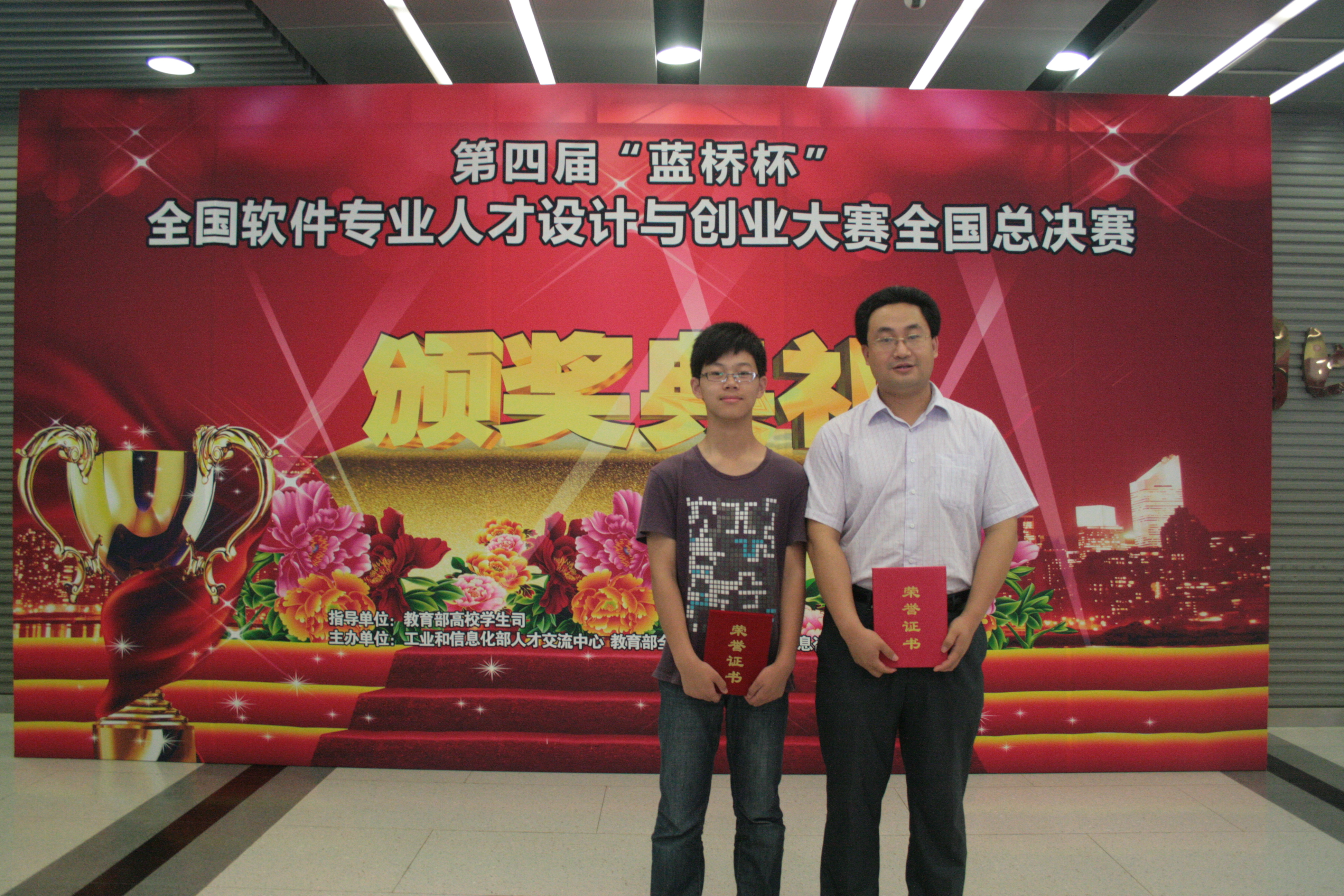 7月13日,第四届“蓝桥杯”全国软件专业人才设计大赛在北京大学体育馆圆满落下帷幕,由玩球直播 李建波副教授指导的邢召龙同学荣获C/C++程序设计B组总决赛全国一等奖,我校荣获“成绩优胜学校”及“优秀组织单位”称号。
