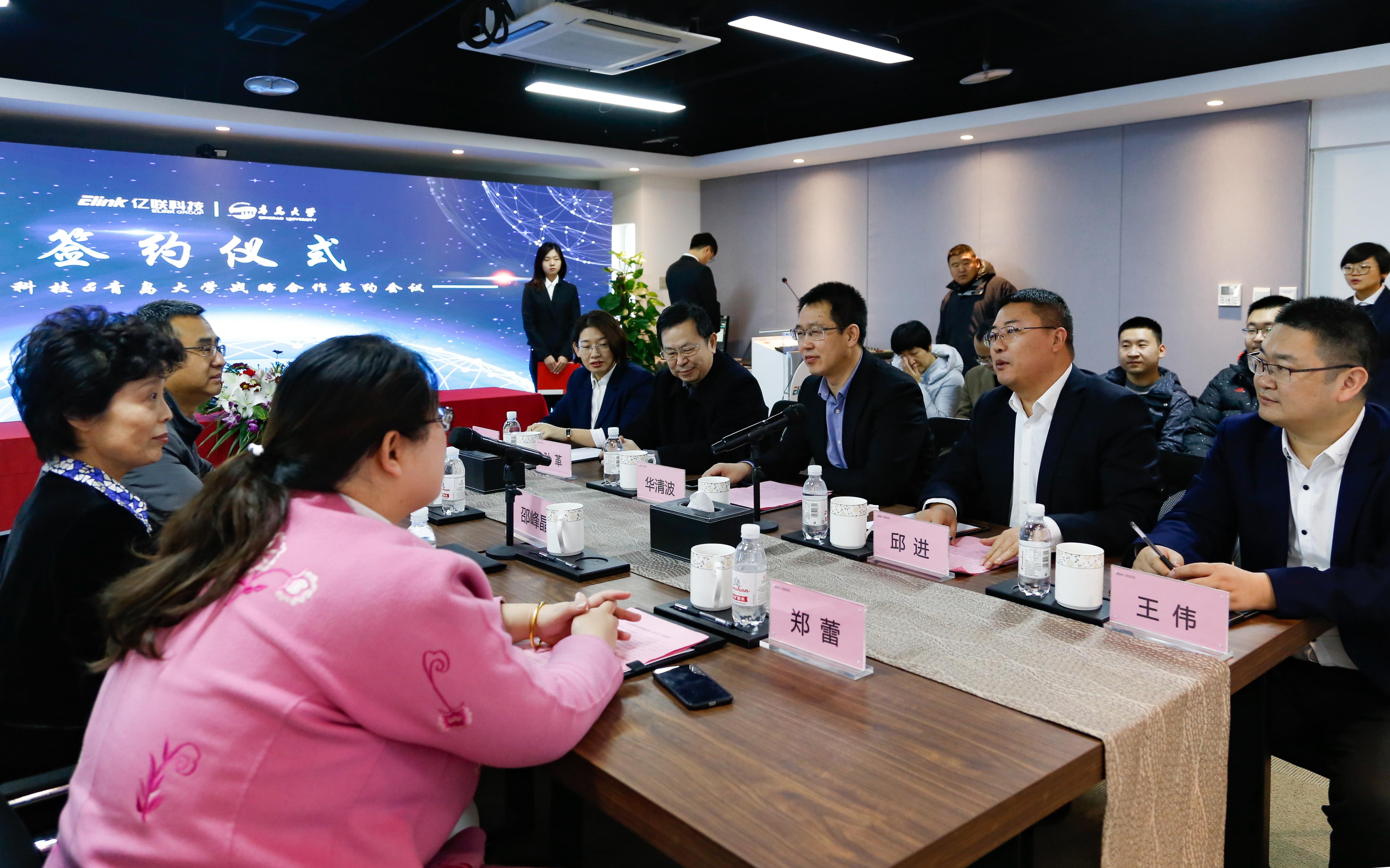 12月27日上午,玩球直播 与青岛亿联信息科技股份有限公司在亿联科技数据之巅展厅举行战略合作签约仪式。山东省政府参事、青岛大学大数据技术及智慧城市研究院院长,原青岛市政协副主席、原玩球直播 副校长邵峰晶教授,亿联科技董事长华清波、总经理邱进、总工程师孙革,玩球直播 玩球直播 党委书记尹增刚,玩球直播 科技处副处长郑蕾以及玩球直播 相关教师和研究生代表出席签约仪式。