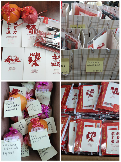 辛克恒、姜彬、陶晓赟及学生会成员为同学们送上“一研为定”考研大礼包和老师、学弟学妹亲手写的祝福。一份温暖的礼包,凝聚着学院领导的关怀与挂念,珍藏着玩球直播