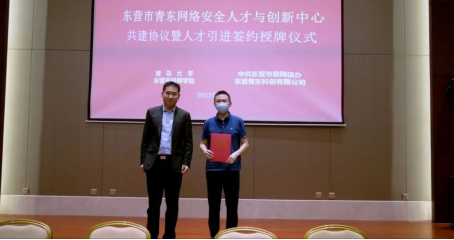 日前,玩球直播 与东营市委网信办、东营市技师学院、东营青东科创有限公司签订协议,共建东营市青东网络安全人才与创新中心。院党委书记潘秋鸿,院长郭振波,信息安全系党支部书记、主任咸鹤群参加了在东营市举行的签约仪式。