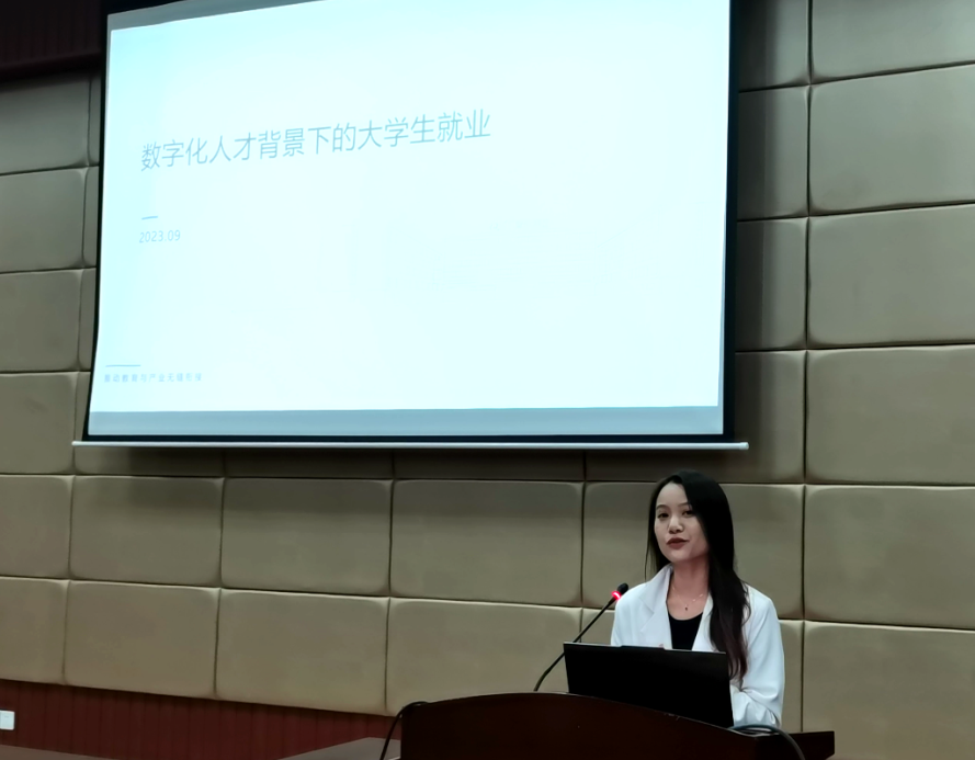 青软集团产教融合业务部副总经理张云作了题为《数字化人才背景下的大学生就业》的报告,介绍了数字化人才的需求趋势,强调了数字技术在各个行业中的应用增长。