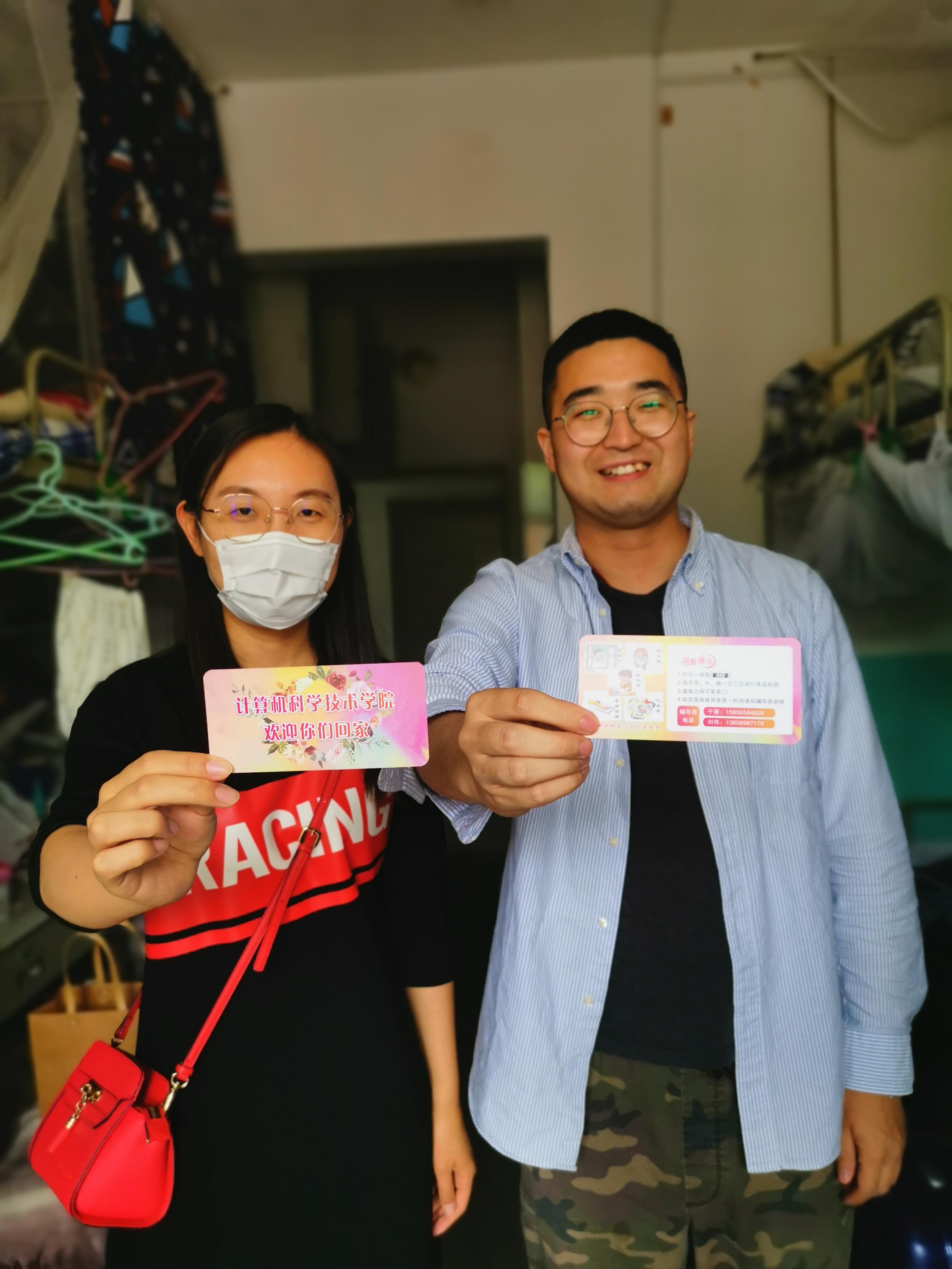 学院辅导员为返校学生送上温馨提示卡片