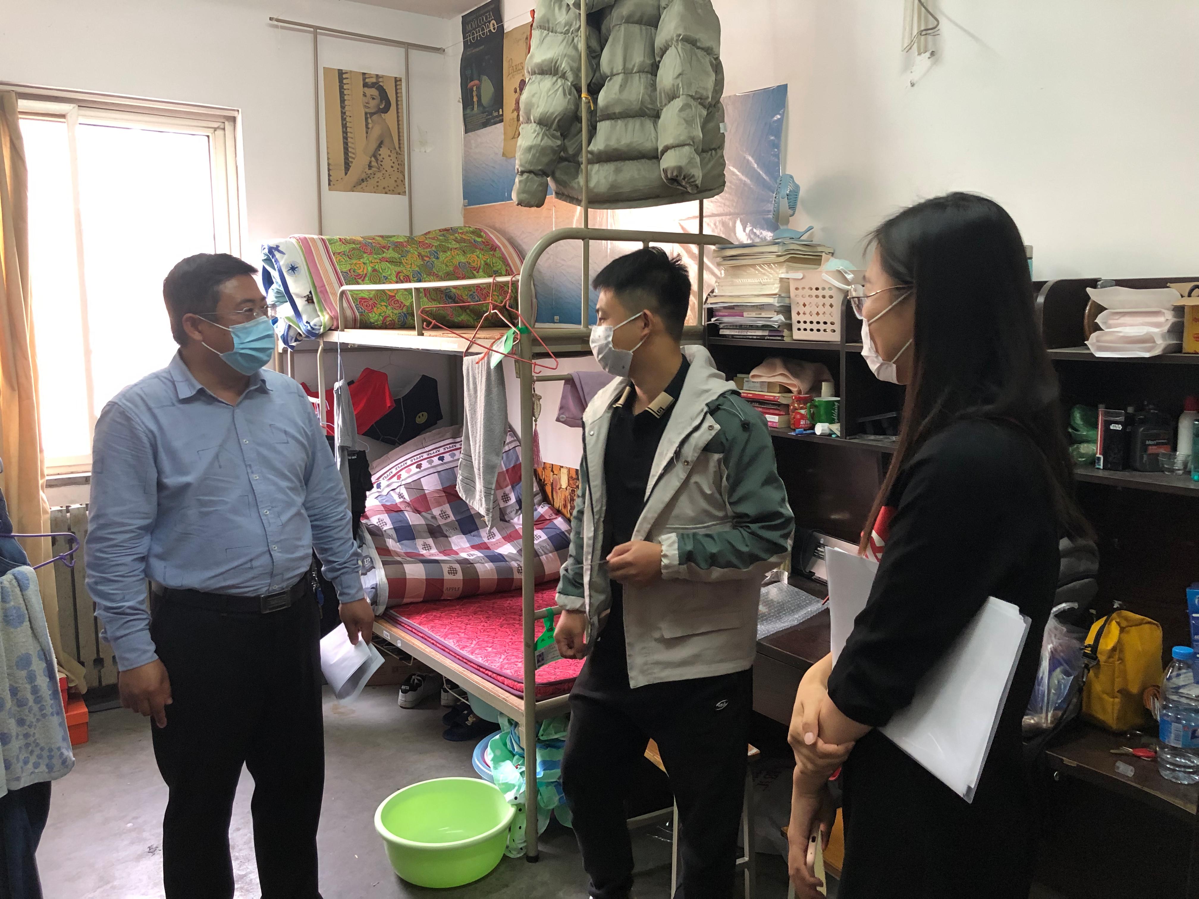 院党委副书记周鹏和辅导员于茜与返校学生在宿舍交谈