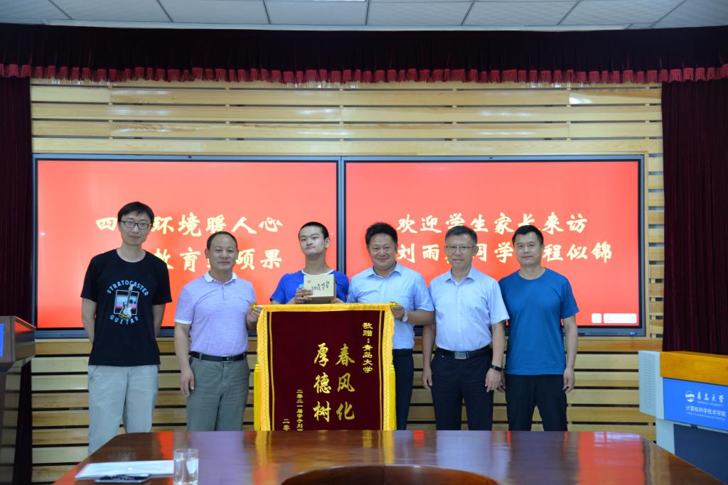 7月9日上午,玩球直播 2021届软件工程专业毕业生刘雨鑫的父亲向玩球直播 赠送了写有“春风化雨 厚德树人”的锦旗,以此感谢学院和老师们四年来对刘雨鑫的照顾与帮助。院长郭振波,院党委副书记张磊,院学工办主任辛克恒和刘雨鑫同学的辅导员李俊参加赠送仪式。郭振波代表学院接受了锦旗,张磊代表学院向刘雨鑫赠送了纪念品。